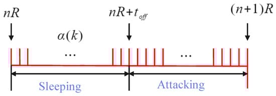 The attacker’s capabilities are constrained, preventing sustained attacks. A periodic DoS attack model, detailed in Figure 2 with parameters , and R representing the period number, the sleeping interval length, and the total period duration, respectively, is considered. The attacker accumulates energy during dormant intervals and executes DoS attacks during designated periods. To evade detection, represents the attack probability variable, following a Bernoulli distribution. A successful attack results in blocked transmission of the latest information ; otherwise, data transmission proceeds . With the expected value , the specifics of the attack strategy are described below.