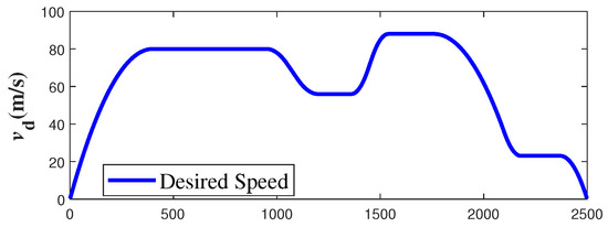 It has been determined that the duration of the operation will be 2500 s, and the sample interval will always be 1 s. The desired speed is shown in Figure 2. The following is a list of several critical parameters that are provided in support of the simulation test: ; ; ; ; ; ; ; ; ; ; . Detailed information regarding the simulation coefficients that pertain to the running resistance can be found in Refs. [31,32]. It is essential to keep in mind that these resistance coefficients are utilized just to produce the fundamental and supplementary resistances encountered during the operation of the train. This particular set of coefficients is not the only one available; other values can be used in their place if required.