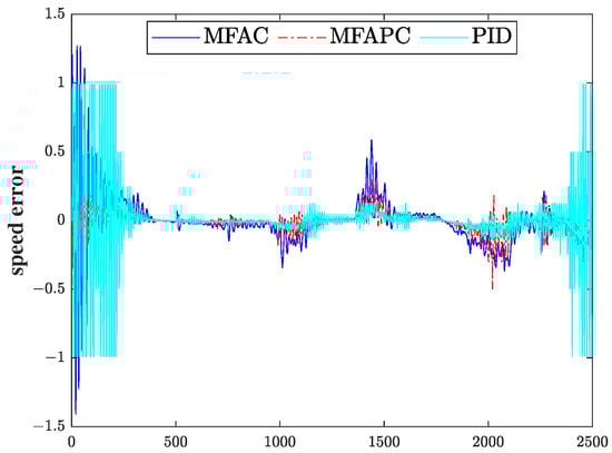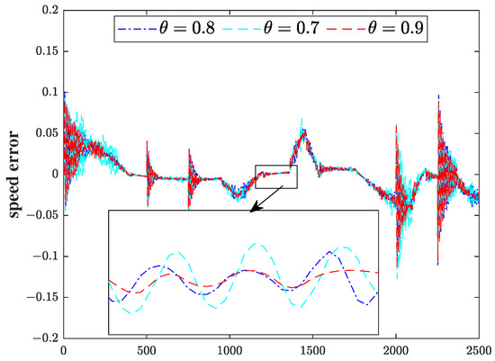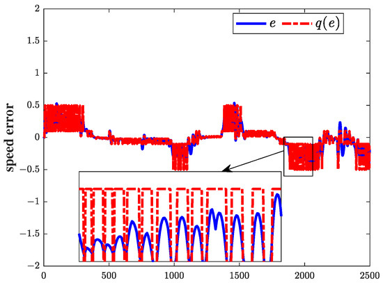 We are thus able to confirm the effectiveness of the activity quantizer. The quantization process of the tracking error is demonstrated in Figure 5. It can be observed that although the values that lie within the same quantization interval are different, the quantizer maps these data to the same values. This processing results in a significant reduction in the disorder of the original signal and the quantized signal becomes significantly more regular. This process shows that the quantizer plays an important role in reducing the frequency of controller updates, thus improving the overall efficiency and stability of the system. See Figure 6 and Figure 7. However, different quantization densities may affect the performance of the controller. In order to investigate this issue, we set different quantization densities, as shown in Figure 8, which displays the speed error curves under different quantization densities. It can be seen that a decrease in the quantization density leads to a decrease in the convergence performance of the error curves.
