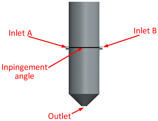In the high-pressure mixer, materials A and B are fed into the mixing chamber through two separate inlets at a high speed and pressure by metering pumps, achieving high-speed collision mixing. The geometric model of the polyimide high-pressure mixer was created using 3D drawing software (Solidworks 2021) to explore the impact of the mixing head’s structural parameters and optimize its structure. The model was used for the fluid analysis of the high-speed collision mixing process of liquids A and B. The structure of the mixing chamber is shown in Figure 2. Materials A and B enter the chamber through inlets A and B. Inside, they collide and mix at high speed at a specific impingement angle determined by the two inlets. The shape of the fluid collision area is complex and irregular due to the high-speed, angled collision, generating intense turbulence and vortices. Rapid changes in the fluid velocity and direction after the collision result in highly irregular, nonlinear flow paths. Additionally, the significant velocity gradient within the collision area causes uneven material distribution and pronounced shear interactions between the fluids. These factors collectively contribute to the complexity and unpredictability of fluid flow within the mixing zone. After mixing, the materials exit the chamber through the outlet. The inlet diameters for components A and B are 8 mm, the outlet diameter is 35 mm, and the impingement angle is 180 degrees.