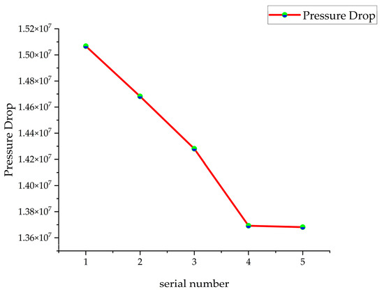 The mixer was meshed using the grid function in Fluent software (Fluent 2022). As the study focuses on impingement mixing effects rather than flow details near the wall, the boundary layer was not considered. This simplifies the model and conserves computational resources. Due to the complexity and irregular shape of the fluid collision area, the number of grids significantly affects calculation accuracy. Too many grids increase the computational burden and prolong calculation time, while too few compromises precision. Therefore, selecting an appropriate number of grids is essential. The mesh element quantities for the five sets of plans are listed in Table 1, and the resulting pressure drop is shown in Figure 3.