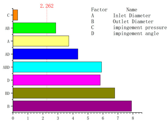 To analyze the impact of varying structural parameters on mixing unevenness, factor analysis was conducted using the simulation results of the mixing head flow field. The numerical simulation results were used as the ordinate, and the levels of its four structural parameters were used as the abscissa. The experimental data were processed with MINITAB, resulting in a pareto chart of the standardized effects of the response variables, as shown in Figure 7. From Figure 7, it is evident that the inlet diameter, outlet diameter, and impingement angle significantly impact the mixing effect, while the effect of impingement pressure is relatively small. The influence order of each structural parameter on mixing unevenness is: mixer outlet diameter > impingement angle > inlet diameter > impingement pressure. It can be observed from the figure that the impact of impingement pressure on the mixing effect is minimal and can therefore be disregarded.