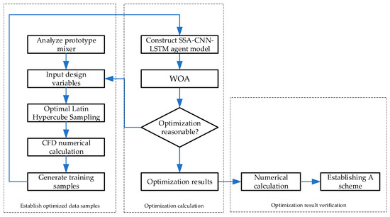 This paper optimizes the structural parameters of the polyimide mixer to minimize mixing unevenness. Four structural parameters were selected for significance analysis to determine their impact and eliminate insignificant ones, thereby reducing computational effort. The proposed optimization process combines sample extraction, approximate model establishment, and optimization algorithms. OLH was used to select samples for training the approximate model, and numerical simulation results for each sample were computed. An SSA-CNN-LSTM surrogate model was constructed to fit the relationship between optimization objectives and variables. The WOA was used to find the optimal solution. If the optimization results meet the design requirements, the search is concluded, and the results are subjected to simulation and experimental validation. If the results are unsatisfactory, variables are reselected for further optimization until the requirements are met. Figure 8 illustrates the mixer optimization process based on the SSA-CNN-LSTM-WOA.