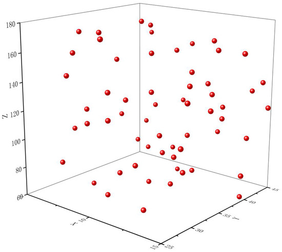 The training samples should be at least ten times the number of input variables. To ensure credible results, this paper uses OLH to draw 60 sample points from the sample space, as depicted in Figure 11. Based on these samples, 60 mixer models are constructed in 3D drawing software, resulting in 60 CFD computational models. The numerical simulation method is identical to the one used for the prototype mixer discussed earlier, producing 60 sets of data for mixing unevenness corresponding to 60 sets of parameters. A sample database is established, as shown in Table 4.