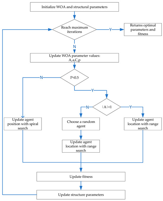 The optimization process of the WOA is as follows: First, initialize the WOA parameter values and input the structural parameters to be optimized. At the beginning of each iteration, check if the maximum number of iterations has been reached. If it has, return the current best structural parameter values and their corresponding fitness values. If the maximum number of iterations has not been reached, update the WOA parameters (A, a, C, and Pa).