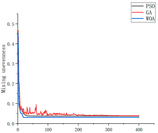 The optimization performance is highlighted by comparing optimization times and the optimization effects of the best fitness values. The results are shown in Figure 19. From the figure, it can be seen that the GA requires 303 iterations to obtain the optimal parameter values, PSO also requires 41 iterations to achieve the optimal parameter values, while the WOA only needs 17 steps to obtain the best optimization solution. At the same time, compared with the GA and PSO, the WOA yields better optimization results. According to the previous text, the lower the mixing unevenness achieved, the better the performance. Here, combined with Figure 4, Figure 5, Figure 6, Figure 7, Figure 8, Figure 9, Figure 10, Figure 11 and Figure 12, it can be observed that the best solutions obtained by the GA, PSO, and WOA are 0.039, 0.037, and 0.03, respectively. Through comparison, it can be seen that the WOA has a faster optimization speed and can achieve better optimization results with fewer iterations. After optimization by the WOA, the best structural parameters obtained are: inlet diameter of 7, outlet diameter of 31.6, and impingement angle of 119.5°.
