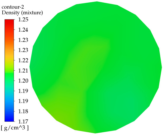 To improve the mixing performance of the mixer head, an internal flow field analysis is conducted. Based on the prototype mixer, the effect of the mixer head’s geometric parameters on mixing efficiency is investigated by altering dimensions such as the inlet diameter, outlet diameter, impingement angle, and impingement pressure. This serves as a foundation for further explorations into enhancing mixing efficiency and optimizing the mixer’s structure. After setting the boundary conditions, the flow field analysis of the mixing head is conducted. A density contour plot for the outlet section of the mixing head is generated to make the results more visually intuitive. The figures used in this document are exclusively density contour plots. The relevant density contour plot is shown in Figure 6.