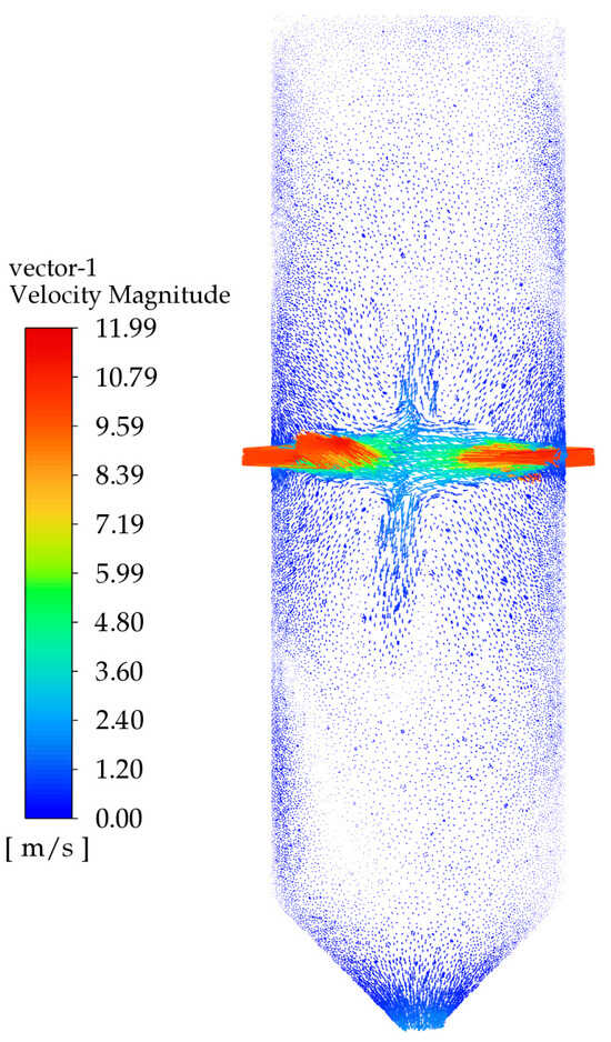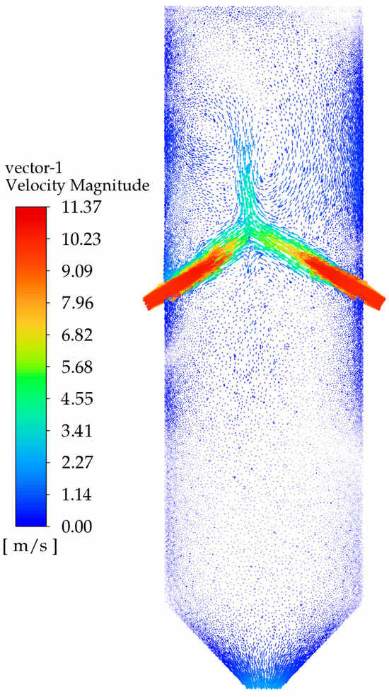 Figure 21 shows the velocity vector diagram before optimization. As seen in the figure, due to the excessive impingement angle, the liquid’s velocity decreases sharply after collision, almost no vortices are generated, and the high-speed region is concentrated. The velocity gradient is significant, and the liquid almost exits the mixer without hitting the walls, resulting in poor mixing. Figure 22 shows the velocity vector diagram after optimization using the joint optimization algorithm. The figure illustrates that the two materials collide at a certain angle, resulting in less velocity loss compared to the original mixer, and generating a certain number of vortices, which improves the mixing effect. Additionally, Figure 22 indicates that the velocity changes smoothly at the intersection, with the velocity vectors being more uniform and the velocity gradient being smaller. Based on the analysis of the velocity changes and vortex structures, it can be concluded that the flow characteristics within the optimized mixer are more conducive to mixing compared to the original mixer.