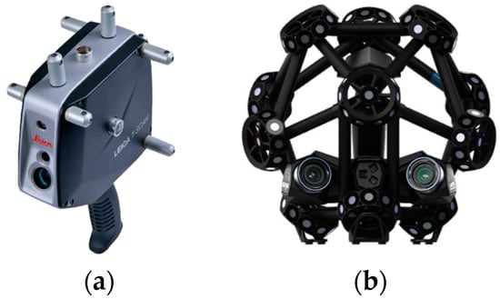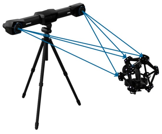 As can be seen from the above principles, the line laser scanner is able to obtain the two-dimensional height displacement distance of the points on the surface to be measured in the reference plane, and all the data obtained are based on the scanner’s local coordinate system. The measuring system is calibrated by the use of a one-dimensional calibration bar and calibration plate. The internal and external parametric errors of the two cameras of the optical tracking system and structural parameters of the scanner are thus calculated precisely; because the angle between the camera and the scanner is known, these values can be used to triangulate the spatial position of the scanner in 3D space and unify the point cloud data obtained by the scanner into the tracking system. The point cloud data acquired by the scanner are unified into the measurement coordinate system of the tracking system, and the 3D coordinates of the point cloud data under the measurement coordinate system are obtained. The point cloud data are stitched together to ensure the overall measurement accuracy of the model. The measurement system consisting of the line laser scanner and the optical tracking system is shown in Figure 5.