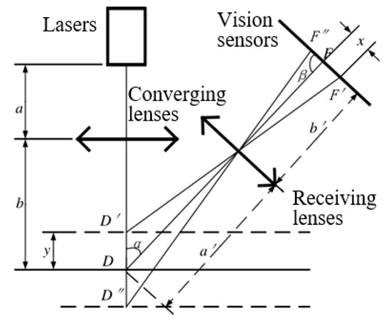 During the measurement process, the laser line is emitted from the laser and directed through the converging lens onto the surface of the part to be measured. After modulating the surface of the part to be measured, the reflected laser line passes through the receiving lens to form a light spot on the vision sensor. As the height of the surface of the part to be measured is different, the position of the light spot on the vision sensor is offset accordingly. If the surface of the part to be measured is at reference surface , the spot on the vision sensor will be at point . If the surface of the part to be measured is higher than the reference surface at a distance of y, the spot on the vision sensor will be at point and the spot offset on the vision sensor will be ; conversely, if the surface of the part to be measured is lower than the reference surface at a distance of y, the spot on the vision sensor will be at point and the spot offset on the vision sensor will be . The relationship between the actual displacement of the part to be measured and the imaging displacement is shown in Equation (1):