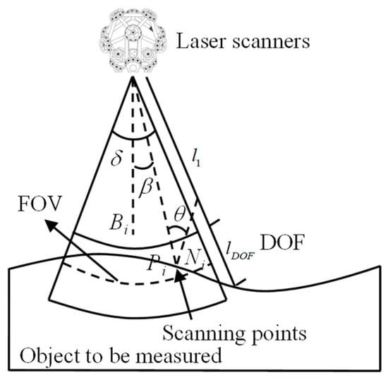 denotes a point on the surface to be measured, is the unit normal vector of the surface point , denotes the spatial position of the laser center point of the laser scanner, and denotes the angular bisector of the field of view. The measurement model is described as follows: