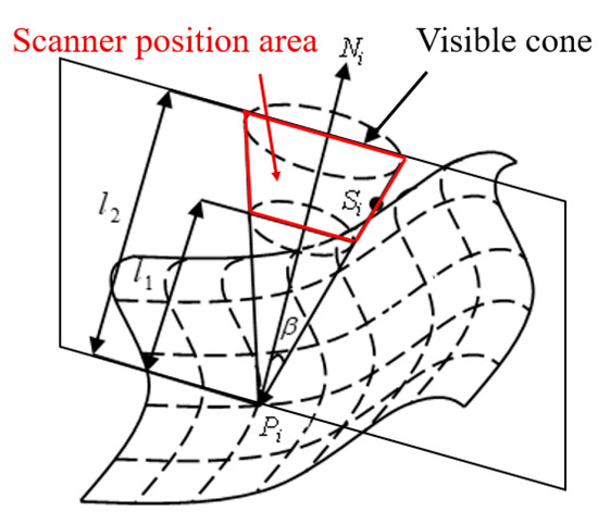 The concept of the viewable cone is applied to the 3D scanning process to perform the scan viewpoint calculation. As shown in Figure 11, is the surface measurement point, is the unit normal vector of , is the angle between the vector and the normal vector, is the scanning viewpoint, is the scanning direction vector, is the near depth of field distance, and is the far depth of field distance. According to the scanner measurement constraints, the set of scan direction vectors can form a cone with as the vertex, the unit normal vector as the cone axis, the depth of field as the cone height, and the measuring field of view as the cone angle in the visible range, called the viewable cone of the surface measurement point . When the scanned viewpoint lies within the viewable cone, the maximum angle between the vector and the normal vector is the measuring field of view angle , satisfying the measuring field of the view constraint, and when the scanned viewpoint lies between the near depth of field distance and the far depth of field distance , it satisfies the depth of the field constraint.