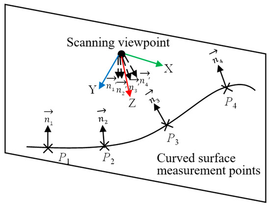 is the surface measurement point formed by sampling the free-form surface, where coordinates and normal vectors can be calculated; are the scanning viewpoints that satisfy the measurement constraints of the laser scanner; is the scanning attitude corresponding to the position of each scanning viewpoint. In the actual scanning measurement process, the laser scanner scans along the path from to with the scanning attitude, moves to the position, first adjusts to the scanning attitude, and then scans along the path from to with the scanning attitude, etc. The entire scanning and measuring process is completed by moving to position . In summary, scan path planning is essentially scan viewpoint planning and scan attitude calculation.