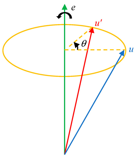 It can be deduced that the representation of u′ after any vector u in three-dimensional space is rotated along the unit vector e by the angle , as shown in Equation (11):