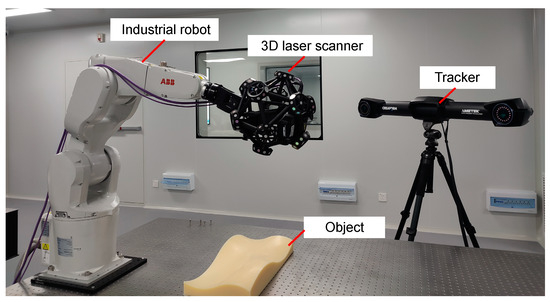 As shown in Figure 16, the constructed experimental system consisted of an industrial robot, a 3D laser scanner, a tracker, and a free-form surface part to be measured. In order to align the object to the industrial robot, four pairs of marker points, which were the four corners of the industrial robot base and the four corners of the object base to be tested, were set, and the two-dimensional distance in the XY-direction of the four pairs of marker points in the simulation environment were obtained. Then, the industrial robot was fixed and the vernier caliper was used to measure the distance of the relevant mark points to obtain the position of the corresponding mark points on the actual optical platform. Then, the object was placed corresponding to the actual mark point position to complete the actual positioning work.
