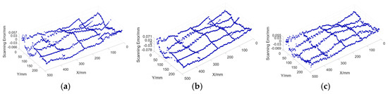 Based on the adaptive sampling method proposed in this article, the robot scanning measurement results were analyzed against the CMM’s measurement results. The CMM’s measurement results are points in 5 lines in the X-direction and 5 lines in the Y-direction, uniformly covering the free-form surface. The length of the measurement points in the X-direction was about 480.8 mm and the length in the Y-direction was about 230.4 mm. The number of all points was 1634. The CMM’s measurement results were set as standards (conventional true value), and the surface scanning error was the value difference in the Z-direction of the object of these points measured by the laser scanner and the CMM. The error distribution obtained is shown in Figure 17. It can be seen that the maximum deviations are 0.066 mm, 0.078 mm, and 0.069 mm, respectively. The standard deviations are 0.020 mm, 0.023 mm, and 0.022 mm. From the measurement results, it can be seen that the maximum error of the accuracy of the scanning measurement path generated based on the method proposed in this paper is within the accuracy range of the 3D laser scanner, which indicates that the generated scanning measurement path is guaranteed by the measurement accuracy of the 3D laser scanner.