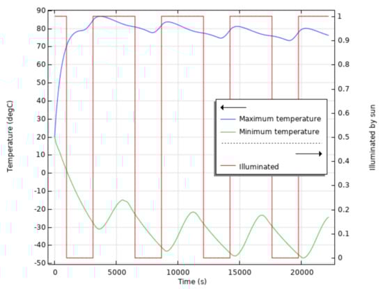 Spacecraft as well as instruments used in the spacecraft experience a wide range of ambient temperatures. For instance, temperatures in space can vary dramatically, from as low as −170 °C to as high as 123 °C, depending on the orbit and the spacecraft’s exposure to the Sun [55]. So, the extreme temperatures encountered in space are a critical factor for piezoelectric actuator and motor design and operation. The piezoelectric devices are exposed to intense thermal variations, ranging from the severe cold of deep space to the intense heat from direct sunlight. Managing these extreme temperature conditions is crucial for the survival and functionality of the devices. One of the most significant challenges is the thermal cycling experienced by piezoelectric motors and actuators, which can affect their performance and longevity in demanding environments such as space [56]. When a spacecraft orbits a planet or moves in and out of a celestial body’s shadow, it undergoes rapid temperature changes as shown in Figure 2 for positive and negative temperature cycling inside the nanosatellite, respectively. This cycling can cause materials to expand and contract, leading to stress and potential structural failure over operation time. So, piezoelectric actuators and motors used in space must withstand these constant changes [56]. When exposed to direct sunlight, parts of a spacecraft as well as piezoelectric devices can heat up to extremely high temperatures. This is particularly challenging for devices and systems in close proximity to the Sun or for missions to inner planets like Mercury. Thermal shielding, reflective coatings, and heat-resistant materials are essential for protection against solar heating [57,58,59,60]. Conversely, in the absence of sunlight, such as on the dark side of a planet or in deep space, temperatures can plummet to extremely low levels. This cold can cause materials to become brittle and piezoelectric devices to lose performance or malfunction. Insulation and active heating elements are often necessary to maintain operational temperatures. So, it must be taken into account that temperature extremes experienced by flight hardware are a combination of their location with respect to the Sun or a shadow (planet or spacecraft) or in engineered environments, and the overall thermal management of the spacecraft, which might involve the use of thermal radiators, heaters or coolers [61,62,63]. Moreover, the temperature range depends on the selected space mission as shown in Table 1.