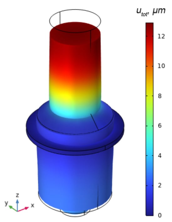 The initial step of the numerical investigations was focused on the modal analysis of the transducer at a temperature of 20 °C. The objective of this analysis was to determine the natural frequency of the first longitudinal vibration mode of the Langevin transducer. The results of the modal analysis are presented in Figure 3. As illustrated, the modal shape of the transducer confirms its operation at the first longitudinal vibration mode and indicates its natural frequency of 27.976 kHz.