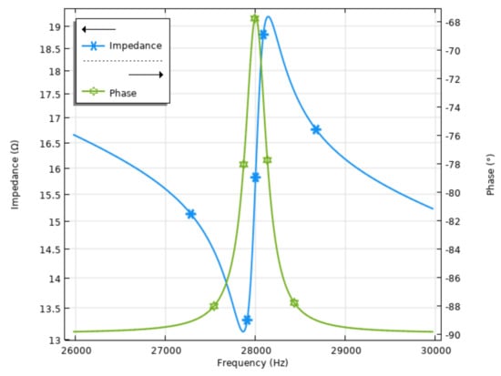 The next stage of numerical investigations was dedicated to calculations of the impedance and phase frequency characteristics of the transducer under a temperature of 20 °C. For this purpose, a frequency domain study was conducted over a range from 26 kHz to 30 kHz, with a step size of 5 Hz while boundary conditions were the same as during modal analysis. The results of the calculations are presented in Figure 4.