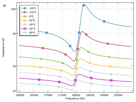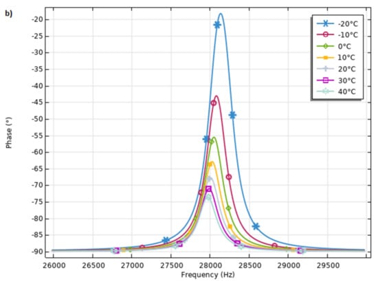 Therefore, the next stage of numerical the investigation was conducted to analyze the impedance and phase frequency characteristics of the transducer under LEO temperature conditions. This study included a temperature range from −20 °C to 40 °C with temperature increment steps of 10 °C. For each temperature setting, a frequency domain study was performed over the range of 26 kHz to 30 kHz with a step size of 5 Hz. The results of the calculations are given in Figure 5.