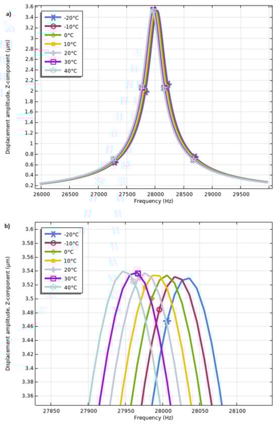 Finally, calculations of transducer frequency-displacement characteristics were performed in order to indicate displacements in relation to temperatures. For this purpose, the frequency domain study was set up with the same boundary conditions as in the case before. The results of the calculations are shown in Figure 6.