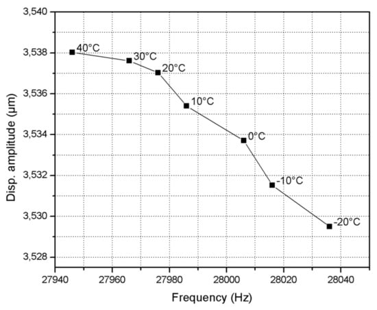 These results indicate that as the temperature increases from −20 °C to 40 °C, the resonance frequency decreases from 28.03 kHz to 27.95 kHz, reflecting a consistent downward trend which was indicated in a previous study and confirmed by calculations of frequency-displacement characteristics. Meanwhile, the displacement amplitude exhibits a slight increase with rising temperature. This temperature-dependent behavior highlights the sensitivity of the resonance frequency to temperature changes, while the displacement amplitude remains relatively stable. Understanding these trends is essential for optimizing the performance and application of piezoelectric devices under varying environmental conditions.