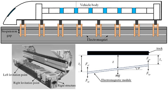 19]. While this method falls short in considering the mechanical coupling effect between the electromagnetic suspension modules, it was pointed out that the electromagnetic module serves as a fundamental component for providing the levitation force in maglev trains.The motion of the electromagnetic module directly influences the stability of train operations [