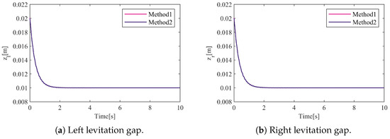 Figure 6. Both control methods tend to stabilize the system. However, Method 1 exhibits significant fluctuations in the suspension gap during the approach to the set value. Method 2, on the other hand, shows a quick attainment of 0 degrees in angle, indicating no coupling effect between the left and right suspension points. Consequently, the suspension gap curve is smoother than when using Method 1. Under Method 1 and Method 2, the closed-loop system exhibits distinct primary vibration frequencies from the