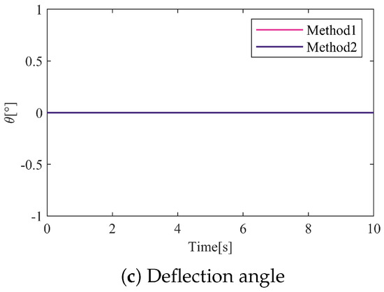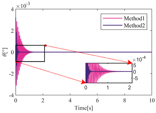 Figure 13. In Method 2, the electromagnetic module exhibits a smaller angle fluctuation and rapidly decreases, whereas in Method 1, the angle fluctuation is larger and convergence to 0 takes longer. Coupled vibration occurs with the electromagnetic module. Similarly,