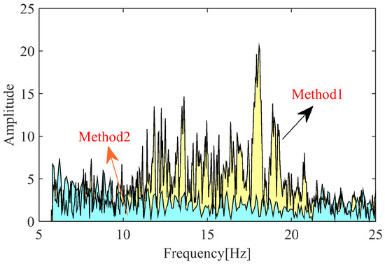 Figure 7. Notably, the amplitude at the primary vibration frequency for Method 1 is greater than that for Method 2.