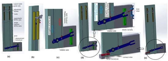 Schematic illustration of the experimental setup for monitoring the interaction between SM shrinkage of NiTiCu wires and SE recovery of NiTiFe wires: (a) general view of the experimental setup, displaying the SM (NiTiCu) and the SE (NiTiFe) wires; (b) fixing detail of the wire upper ends; (c) detail of the lever mechanism with a displacement transducer; (d) experimental setup equipped for thermomechanical cycling, with details of the mechanism of stroke reversion; (e) experimental setup equipped for force measurement.