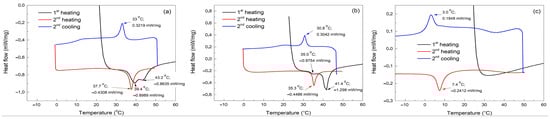 The DSC thermograms recorded during the first heating and second heating–cooling cycle, up to 60 °C, of fragments of the three wires, are illustrated in Figure 3. The first cooling to RT was performed without a controlled temperature variation rate and is missing from the figure.
