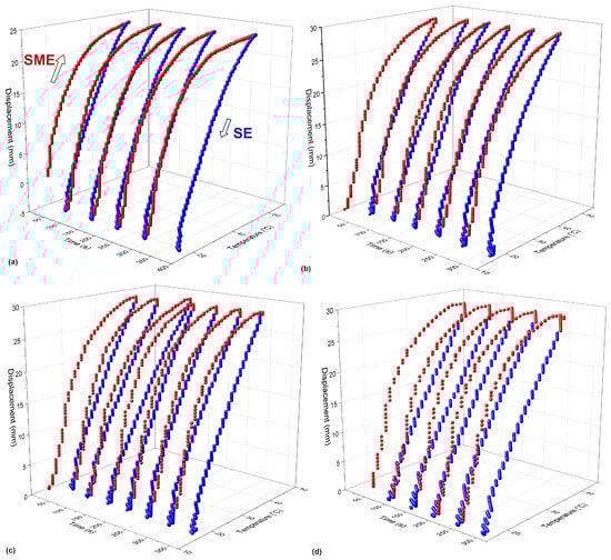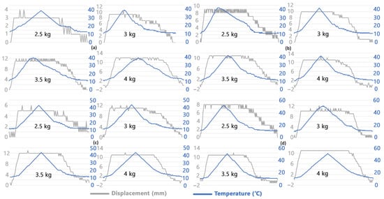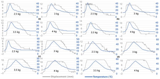 In all of the 16 diagrams from Figure 4, the wires that were elongated at RT by the applied loads shrunk during heating and lifted the loads. The smaller loads, such as 2.5 and 3 kg, could not elongate the wire to a greater extent at RT. For this reason, the displacements associated with these loads were lower. Conversely, the highest displacements were associated with the higher loads, namely 3.5 and 4 kg.