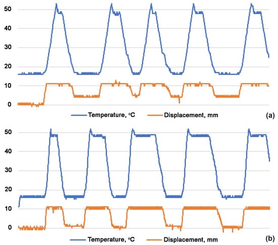 Aiming to compare the cycling capacities of the two SM wires, during repetitive WG-SME development, they were subjected to five cycles of resistive heating up to a maximum temperature of 50 °C, with an applied load of 4 kg. The results are illustrated in Figure 6.