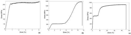 The next tensile tests were performed by loading–unloading, with the aim of monitoring the mechanical response of NiTi-based wires when subjected to reversible deformation. The resulting tensile loading–unloading curves are illustrated in Figure 8, for the three alloy wires under study.