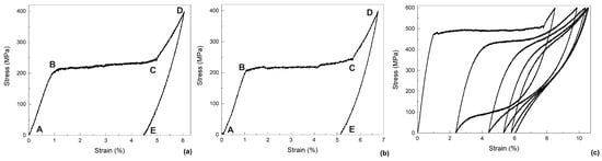 The two diagrams from Figure 8a,b are typical for the plastic deformation of the SMAs that experience a thermoelastic martensitic transformation []. The first quasi-linear portion (AB) corresponds to the elastic deformation of the martensitic wires (as shown in Figure 3, both Ni48Ti52 and Ni45Ti50Cu5 wires were martensitic at RT). The stress plateaus (BC) are generally associated with the crystallographic reorientation of martensite by detwinning. Further deformation caused the elastic deformation of detwinned martensite (CD) which springs back during unloading (DE) []. On the other hand, the diagrams from Figure 8c, revealing an unloading stress plateau, are typical for the super-elastic response of the Ni48Ti50Fe2 SMA wires []. When increasing the number of cycles, both the loading and unloading stress plateaus became shorter and more inclined, while permanent strain increased in terms of absolute value but relatively decreased at the cycle level []. For this reason, the SE description was reduced from an unloading stress plateau to an unloading inflection point.