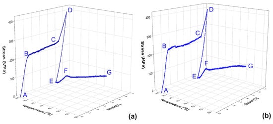 The crosshead of the tensile testing machine was blocked, so the respective permanent strains were subsequently kept constant and the heating chamber was turned on. During heating, stress increased abruptly up to point F which corresponds to the first endothermic peak of the DSC thermograms from Figure 3a,b and represents the midpoint of the reverse martensitic transformation.