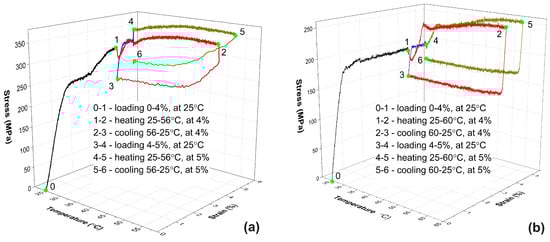 Aiming to determine the behavior of the two SM-wires when undergoing repetitive CR-SME tests, according to the mechanical response from Figure 10, the specimens were (i) elongated to 4% strain at RT, 0–1 and kept in a stressed state in point 1, (ii) heated under a constant strain up to 56 or 60 °C, 1–2, (iii) cooled to RT under constant strain, 2–3, and additionally loaded from 4 to 5%, 3–4, for a second cycle of CR heating (4–5) and cooling (5–6), according to the same routine as in the first cycle.