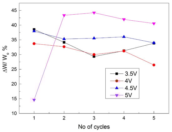 By subtracting the restored energy from the consumed energy and dividing the result (ΔW = W0 − Wrec) by the consumed energy one, can calculate the specific energy dissipated by internal friction, as shown in Figure 12.