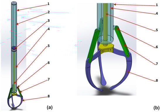 Design of a robotic gripper, actuated with a NiTiCu SM and NiTiFe SE wires: 1—housing; 2—NiTiFe wires; 3—piston; 4—NiTiCu wires; 5—fork; 6—pins; 7—connecting rods; 8—claws. (a) general view; (b) detail of the grasping system.