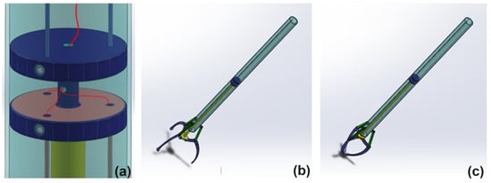 Details of the gripping device: (a) electric connection wires; (b) open position; (c) closed position.