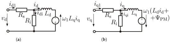 A axis equivalent circuit model of an IPMSM incorporating iron loss resistance; (a) d axis; (b) q axis.