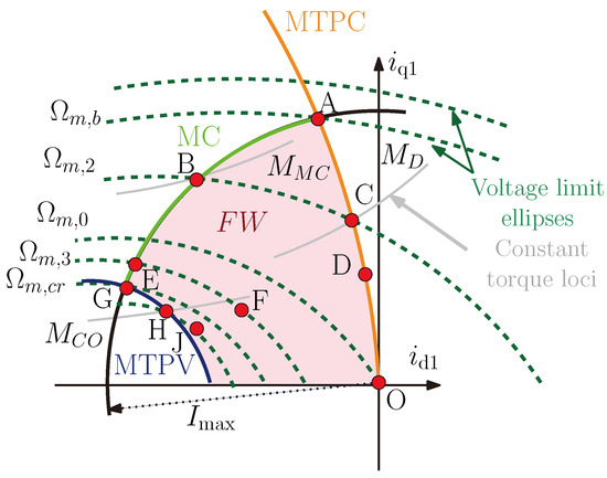 When the mechanical speed is higher than the motor enters into the so-called MTPV region (see Figure 2). The value of the critical speed can be determined by the intersection point of the current limit circle, the voltage ellipse, and the MTPV curve. Above mechanical speed , the d axis reference current should be increased to move the working point along the MTPV curve (see the GH curve in Figure 2).