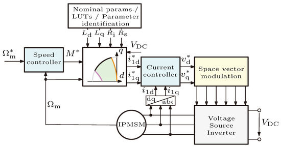 The control scheme of an IPMSM is shown in Figure 3. The figure shows two closed feedback loops. One is a speed control loop, which outputs the reference torque () for the machine to force the actual mechanical speed to track its reference signal. The reference torque and the measured angular speed is passed to the current reference-generating function. For current reference calculation, the machine parameters can be assumed to be constant and can also be passed to the function from the LUT or a parameter identification method. The LUT can be generated using FEM or measurement results. Using these input parameters, the current reference-generating algorithm calculates the appropriate reference currents and for the desired working point. It should be noted that the current reference-generating algorithm takes into account the voltage (4) and current constraints (6).