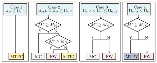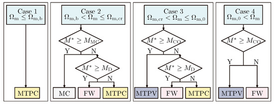 As discussed previously, depending on the reference torque and the actual mechanical speed, four different operating modes can be selected (MTPC, MC, FW, MTPV). An operating mode selector algorithm having four cases (see Figure 4) provides the right mode to calculate the reference currents. It should be noted that the flowchart given in Figure 4 is valid, assuming that . At the end of the section, it is mentioned how the mode selector algorithm is changed if this is not the case.