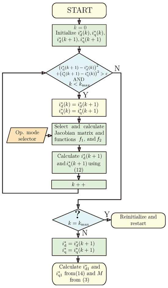 The flowchart of the Newton–Raphson (NR) reference current calculation algorithm is shown in Figure 5. As a first step, the k iteration counter should be set to zero, and the initial value of , , , and should be given. A good solution might be to set the value of and to the actual measured and values of the machine. In this case, and can be set to zero. After the initialization, the iteration process starts. Based on the actual mechanical speed and torque reference, the operation mode selector algorithm can provide the region in which the machine operates (MTPC, FW, MC, or MTPV). Depending on the actual operating mode, as well as machine parameters, the Jacobian matrix (see Appendix A) and the value of the and target functions (see Table 2) can be calculated. By using (12), the value of and can be updated. The iterative process is repeated either until the geometric distance of two consecutive iterations is small (see (13)) or until the maximum number of iterations is reached. Typically, the reference current components rapidly converge to the optimal values. If the maximum number of iterations is exceeded, the algorithm is not converging, and it has to be reinitialized. It should be noted that the iterative scheme outputs the optimal and current reference signals. The actual and reference stator current components, which are the input signals of the current controllers, can be calculated using (14).