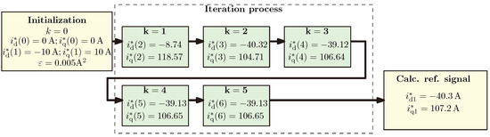 The iterative convergence process of the NR-based reference current calculation algorithm for a working point given in the MTPA region ( rad/s, Nm) is shown in Figure 7. The initial values are selected to be , , and . The current setting precision is set to 5 mA2. As can be seen in Figure 7, the algorithm has a fast convergence rate, and five steps of iteration are required to reach the optimal reference points. The convergence rate of the iteration can be increased, and the required number of iteration steps can be reduced either by choosing initial values closer to the optimal reference points or by increasing the value of . It should be noted that the iterative scheme outputs the optimal and current reference signals. The actual and reference stator current components, which are the input signals of the current controllers, can be calculated using (14).