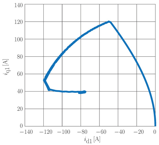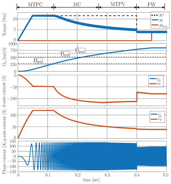 As a first step, the outer speed controller was not considered, and the actual value of the reference torque was generated externally. Figure 9 shows the simulated waveforms of the torque, mechanical speed, d and q axis current components, and one phase current. The values were changed from 0 up to with a ramp signal, and the loading torque was zero. The mechanical speed was increasing, and the machine worked along the MTPC curve. At , the mechanical speed exceeded the base speed, and the machine entered the MC region, where both the current and the voltage reached their limit values. As can be seen, the IPMSM could not provide the reference torque anymore, so the machine accelerated further with a smaller rate. After that, the mechanical speed exceeded the boundary speed, and then, at s, it exceeded the critical speed as well. From this point on, the machine operated along the MTPV trajectory. At s, the reference torque was reduced to 4 Nm. The machine started to operate in the FW region. At s, a loading torque of 4 Nm was applied, and the mechanical speed settled down. Figure 10 shows the trajectory of d and q axis current in the – plane. The trajectories of the MTPC, MC, MTPV, and FW regions are clearly visible.