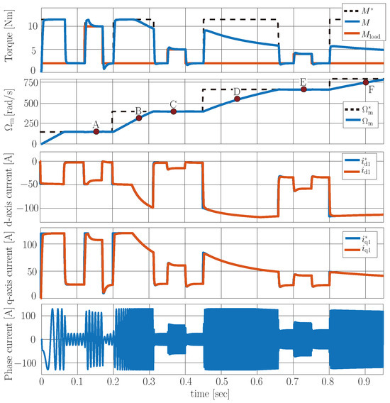 As a second step, the external speed controller was also considered in the simulation. The PI-type speed controller forms the reference torque based on the difference between the reference and the actual mechanical speed . The discrete PI speed controller ran at a sampling rate of 2 kHz, similarly to the current reference generation algorithm. The gains of the controller were calculated using the symmetrical optimum method as and . Figure 11 shows the simulated waveforms of the torque, mechanical speed, d and q axis current components, and one phase current. The trends for the reference mechanical speed and the load torque were determined so that, during the simulation, the drive worked at the working points (see points A, B…F in Figure 8) given in Section 4.2. As can be seen, the current reference generation algorithm works properly for sudden changes in both the reference speed and loading torque. The simulated values are consistent with the calculated quantities (see Table 6, ).