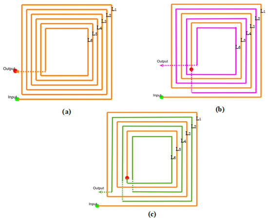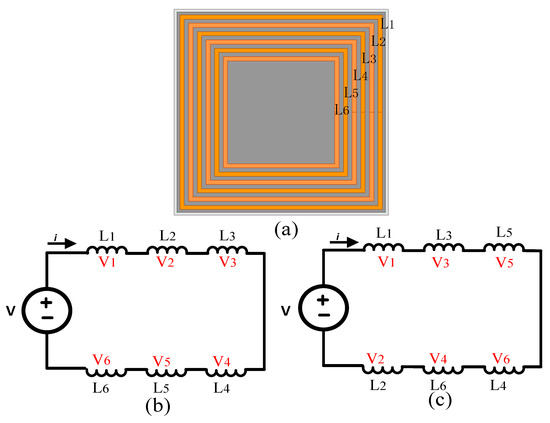 This section elucidates the innovative design principles and structural characteristics of the AVPC, an innovative advancement in EV wireless charging technology. The AVPC’s revolutionary design departs from conventional coil configurations by employing a unique turn sequencing pattern. In traditional coils, as shown in Figure 2a, the current flows sequentially through the turns in the order of L1, L2, L3, L4, L5, and L6. In contrast, the AVPC’s electrical current follows a different path while maintaining the same direction of current flow. In the AVPC design depicted in Figure 2b, the current first flows through the odd-numbered turns L1, L3, and L5 and then through the even-numbered turns L2, L4, and L6. Similarly, in the AVPC design shown in Figure 2c, the current flows through L1, L3, and L5, and then L6, L4, and L2, maintaining the same direction of current flow throughout the coil. This innovative sequencing creates an alternating voltage pattern across the coil, with higher voltage differences between adjacent turns compared to traditional coils.